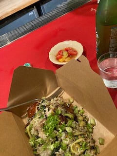 Last is my friend Josie’s music project Rotogator. It’s a noise collage of all these layered tracks, pedals, synths. The sound envelopes the whole room and closes us out. As friends trickle out and leave, Gelnda, Josie and I help Cherry clean up. Putting chairs and tables back to how they were. Silver has begun cooking and I walk down to an empty Neng Jrs. to take out container of pork and rice and green onion with chili oil with a side of cold tomatoes procured with jalapenos. Cherry pours me a ginger seltzer elixir. Silver makes food for him and Cherry while Cherry polishes glasses. I love being in an empty restaurant at the end of a long night shooting the shit with other service workers. We swap service industry stories.